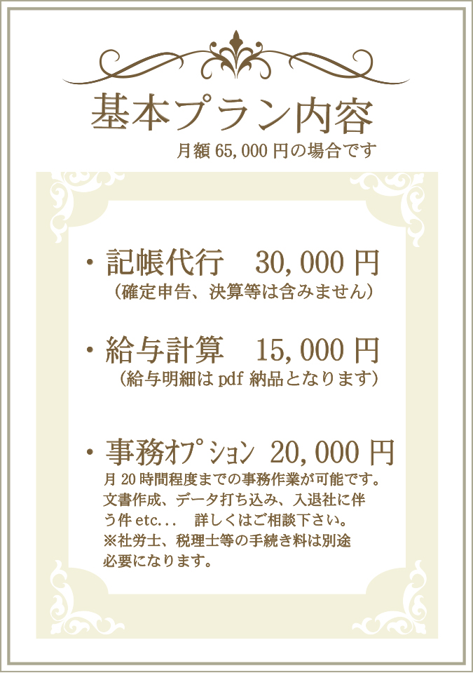 ←65,000円(税抜)の場合の業務内容です。事務オプションがわかりづらい!!というお声が聞こえてきそうですが…詳細はお問い合せ下さい。