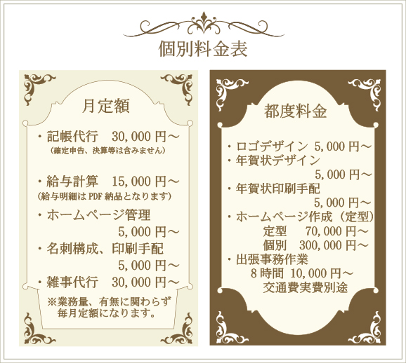 以下については、月定額の場合の記帳代行、給与計算以外の業務内容と、都度頂戴する業務の料金内容になりますが、基本プランをご契約いただいている場合は、事務オプションの費用内で業務可能です。ただ月定額欄にあるホームページ管理、名刺構成・印刷手配、雑事代行については都度ではなく契約期間中は毎月発生する業務としてのみお受けさせていただいております。また、都度料金にある業務内容については、事務オプション額に余剰がある場合はその中でスポットでお受けする業務になります。